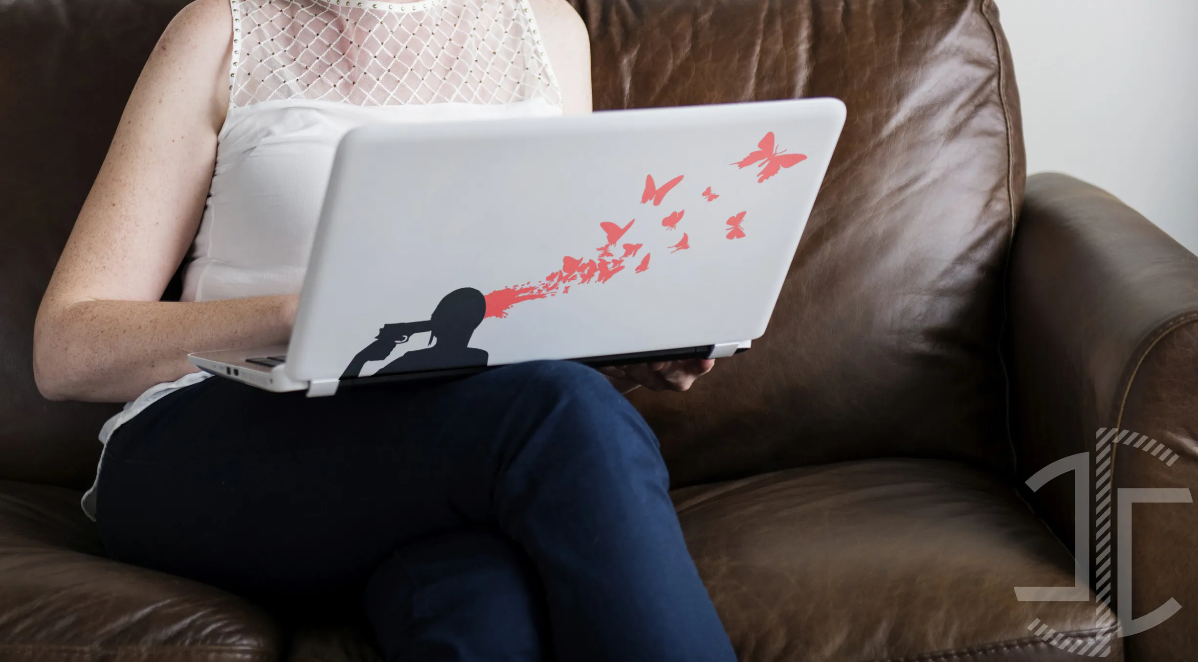 Este decalque, aplicado na superfície de um portátil — a nossa janela para o mundo digital, o trabalho e a informação —, transforma o objeto numa tela de comentário social. Questiona a nossa própria conformidade. Quantas vezes "suicidamos" uma ideia nova por medo do que os outros pensarão? Quantas vezes mantemos os nossos pensamentos mais autênticos acorrentados, preferindo a segurança da caixa em que a sociedade nos colocou? A imagem sugere que a verdadeira criação, a beleza e a liberdade só podem emergir de um ato de rutura, por mais violento que este possa parecer. Este design serve para te recordar : Para que novas ideias possam voar, as velhas prisões mentais têm de ser destruídas.