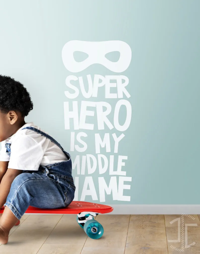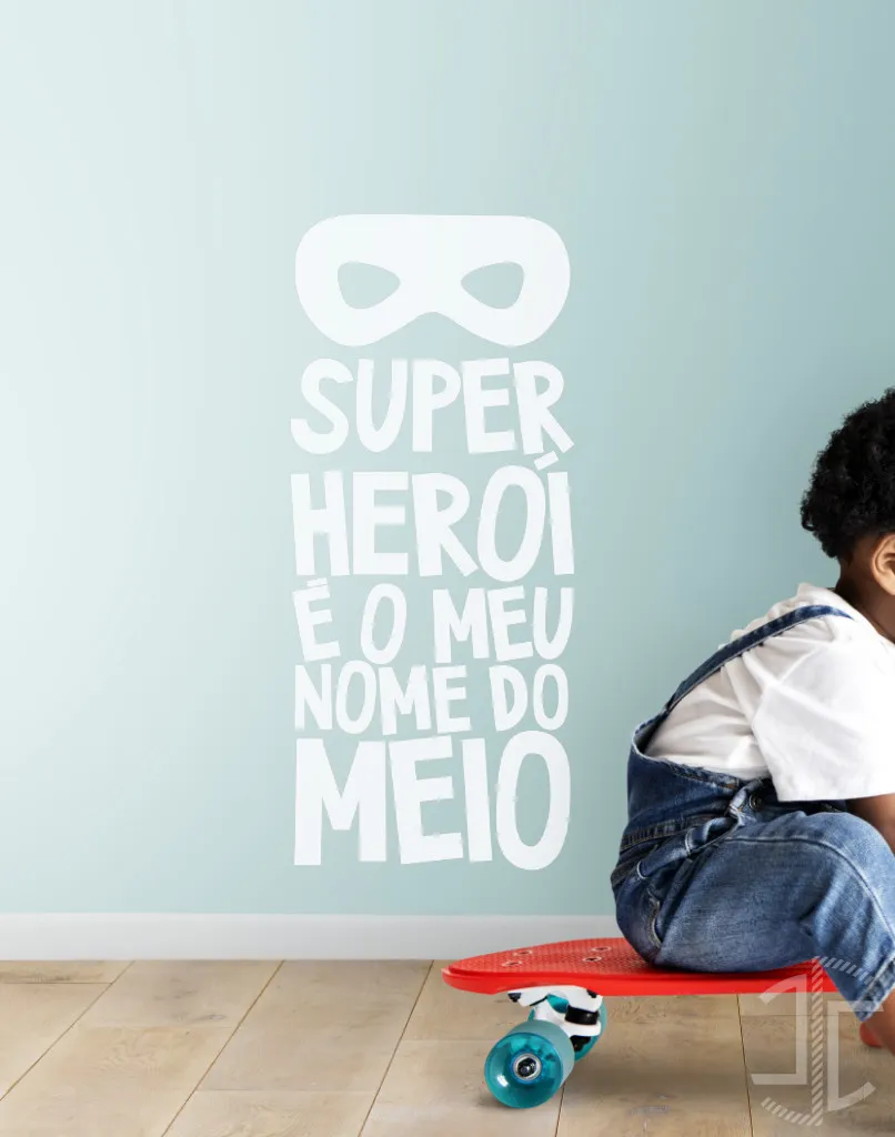 Este decalque tipográfico infantil celebra o poder transformador da imaginação através de uma declaração simples mas poderosa: "Super Herói é o meu nome do meio". A máscara icónica no topo funciona como um símbolo universal de metamorfose, lembrando que todos carregamos dentro de nós o potencial para sermos extraordinários.
