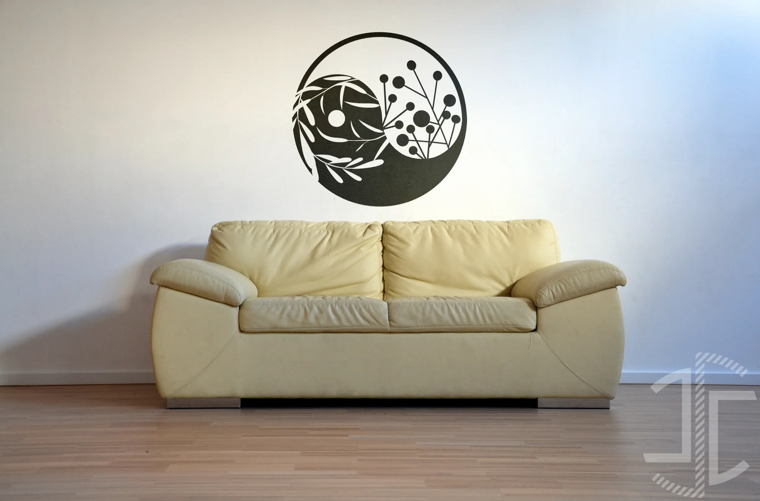 Este decalque decorativo reinterpreta o símbolo ancestral do Yin-Yang através de uma lente naturalista, onde elementos orgânicos substituem as formas tradicionais numa dança visual que celebra a harmonia universal. A composição circular revela folhagens estilizadas de um lado e estruturas naturais com referências moleculares do outro, criando um diálogo contemporâneo entre a sabedoria milenar e a compreensão moderna da natureza.