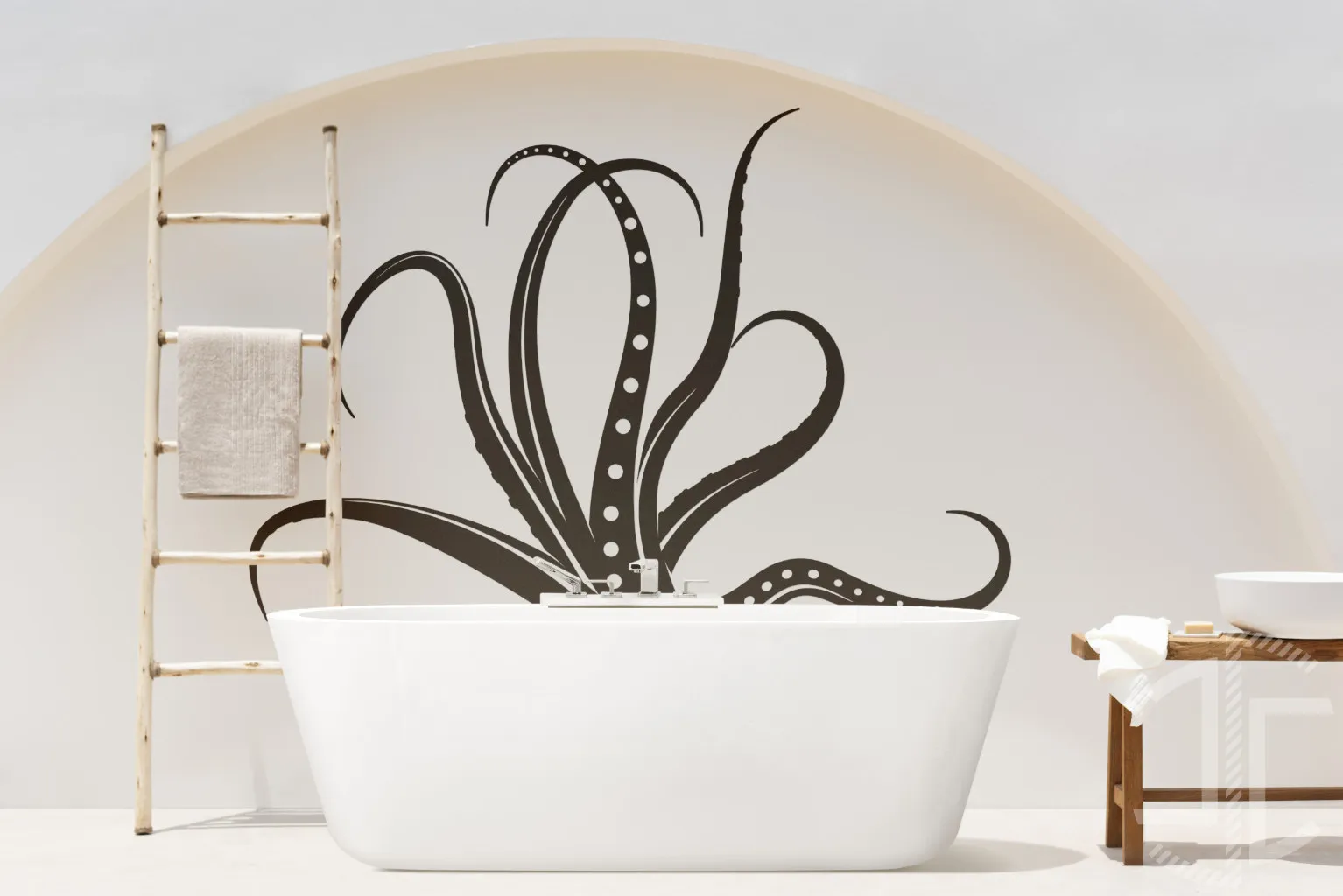 "Tentáculos" é um decalque que não pede licença — instala-se com autoridade estética e uma presença quase mitológica. A figura do polvo, estilizada e expandida em curvas que se estendem pela parede, transforma o espaço num cenário de narrativa submersa. Não há aqui literalidade zoológica: o animal é símbolo, é forma, é movimento.
