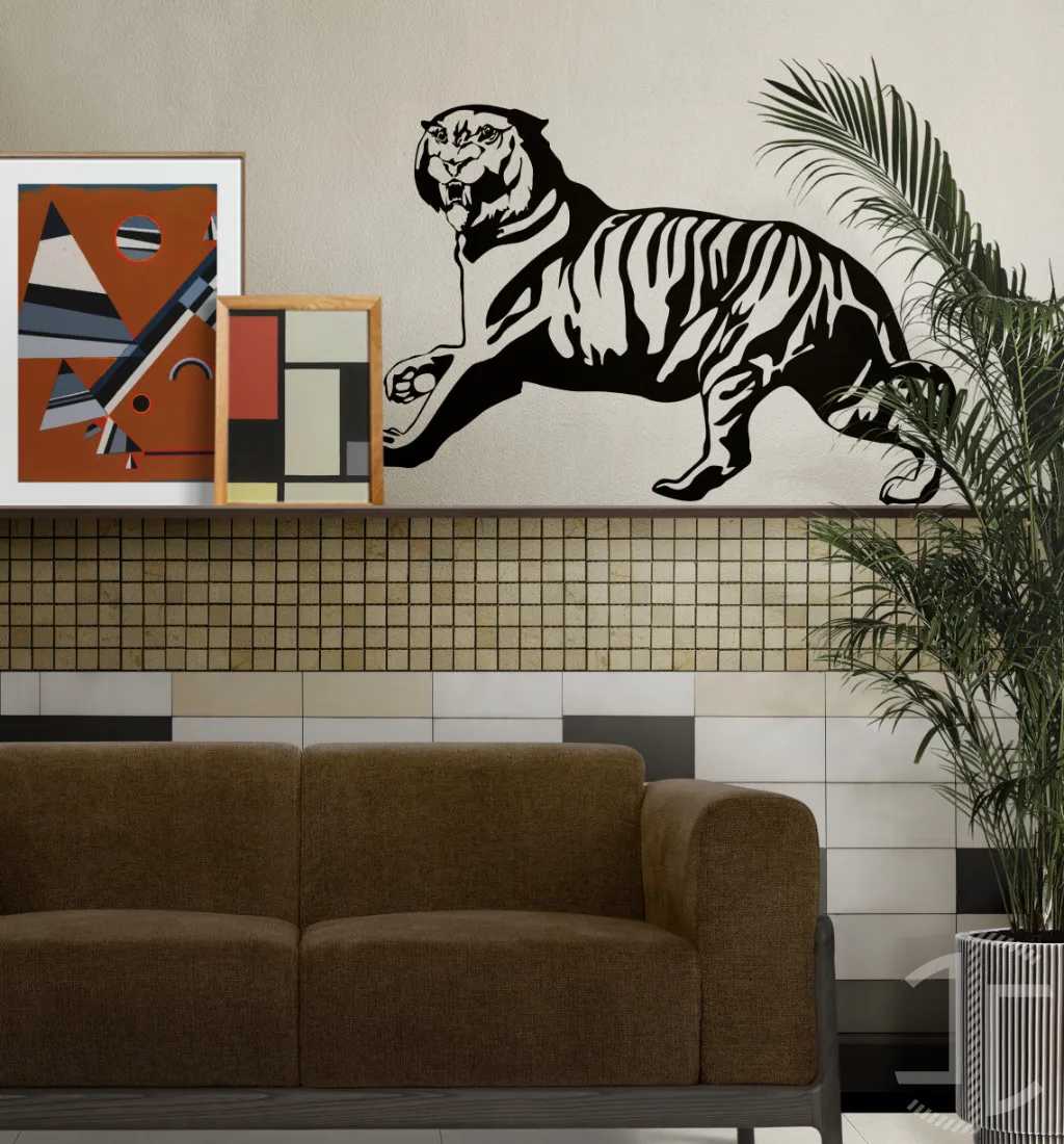 A composição é deliberadamente dinâmica. O tigre avança, mas a sua cabeça está virada para o observador, quebrando a linearidade do movimento e criando um ponto de confronto direto. O rosnar, com as presas expostas, não deixa margem para dúvidas quanto à sua natureza selvagem e indomável. A estilização das formas, desde a expressão facial até à curvatura da cauda, confere à imagem uma qualidade gráfica poderosa, que se afasta do realismo fotográfico para abraçar uma linguagem visual mais impactante e simbólica. Em qualquer ambiente, este design atua como um catalisador de energia, introduzindo um elemento de vitalidade crua e uma estética que evoca a beleza perigosa do mundo natural. É uma peça para quem não teme a intensidade, e que entende que a decoração pode também ser uma afirmação de carácter, refletindo uma admiração pela graça, pela força e pela soberania instintiva.