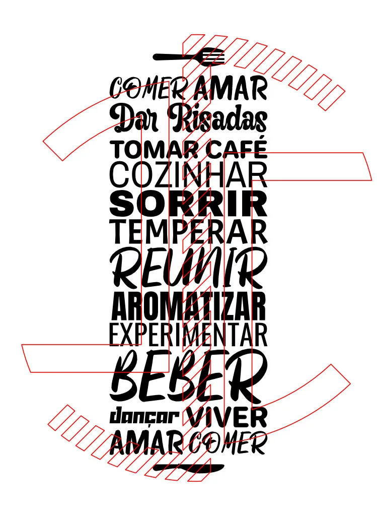 A composição, artisticamente disposta com uma variedade de tipos de letra que conferem dinamismo e personalidade, é uma lista poética de verbos que descrevem não só atividades culinárias, mas também a plenitude da experiência humana. Verbos como "Comer", "Cozinhar", "Temperar", "Aromatizar" e "Experimentar" ancoram o decalque na sua função prática, evocando os aromas e sabores que enchem uma casa. No entanto, é a inclusão de palavras como "Amar", "Dar Risadas", "Sorrir", "Reunir", "Beber", "Dançar" e "Viver" que eleva esta peça para além de um simples lembrete culinário, transformando-a num manifesto sobre a alegria de estar em casa, rodeado de quem se gosta. A presença de um garfo e colher no topo e uma faca na base reforça subtilmente a temática gastronómica, emoldurando a mensagem.