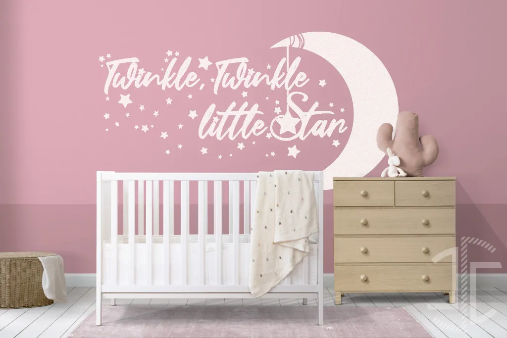 A melodia infantil que embala gerações transforma-se aqui num delicado convite visual ao sonho e à serenidade. Este decalque decorativo em vinil recupera a essência da cantiga tradicional "Twinkle Twinkle Little Star", criando uma atmosfera mágica que convida os mais pequenos a mergulhar no mundo dos sonhos.